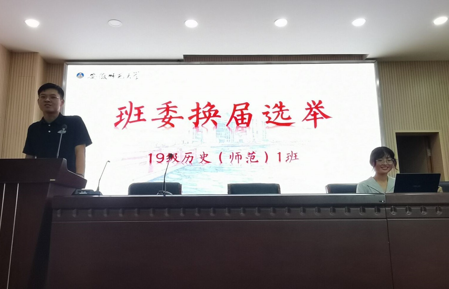 (本网讯 图/文 刘燕杰)2020年9月15日中午12点半,历史与社会公司历史师范1班在公司楼二楼会议室顺利开展了2020-2021学年新任班委换届竞选活动。辅导员周玲燕老师和全体同学出席此次班委竞选活动。