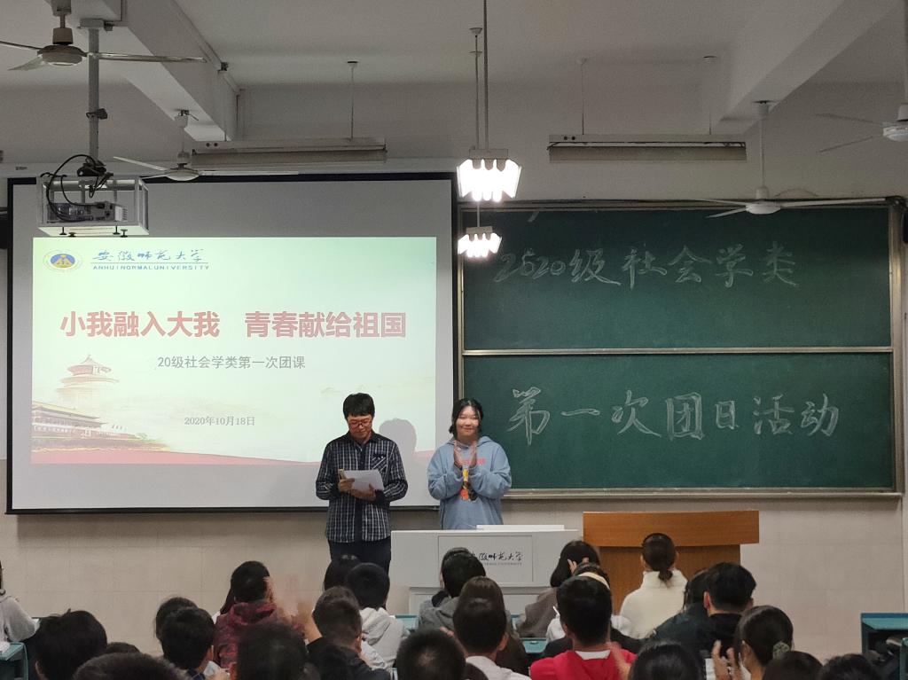 (陈梦熙 程冉)10月18日晚,20级社会学类1班新生在2040303教室成功举办第一次团日活动,本次活动的主题为“小我融入大我,青春献给祖国”。