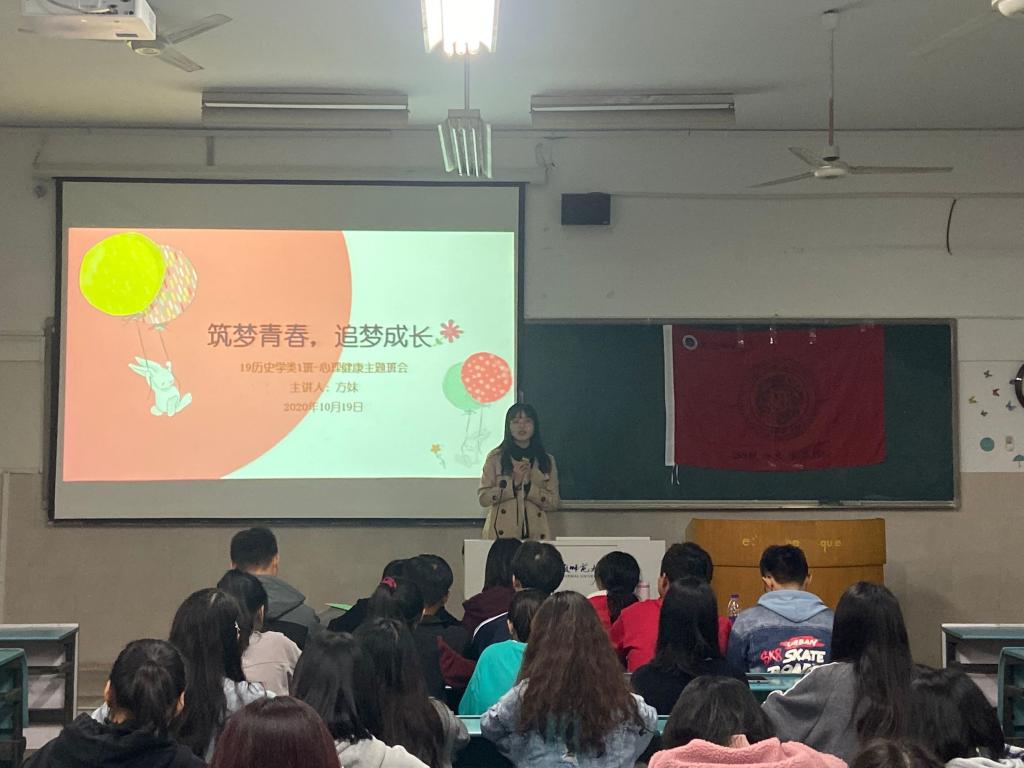 (本网讯 刘燕杰 方妺)为了加强班级员工心理健康教育工作,普及有关心理健康知识,缓解学习和生活压力,引导同学们保持健康开朗的心理状态,形成正确的心理健康观念,19历史师范一班于在辅导员周玲燕老师的指导下于10月19日晚七点半在2030501教室召开了“筑梦青春,追梦成长”心理健康主题班会,班会由心理健康委员方妺主持,班级全体同学参加。