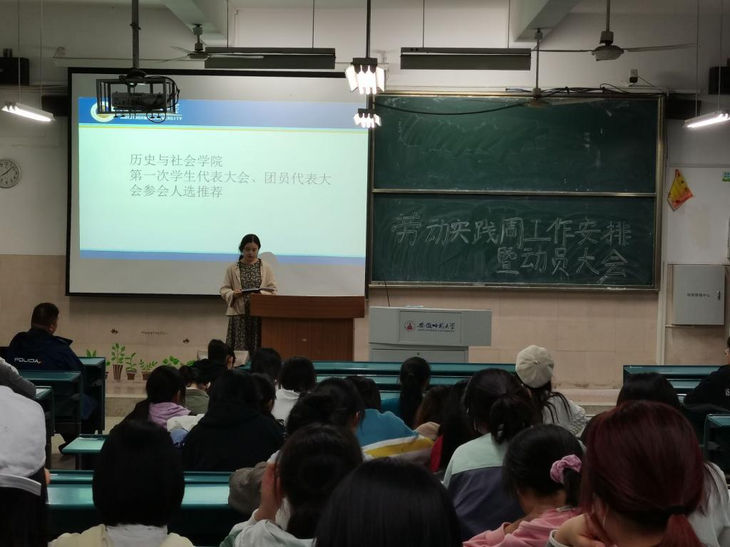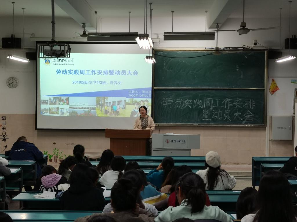 (本网讯 图/文 19历史刘燕杰)为弘扬劳动精神,引导员工崇尚劳动、尊重劳动,强化劳动教育内涵在同学们心中的引领作用,调动同学们劳动积极性,唱响劳动之歌,2020年10月31日晚,辅导员周玲燕老师于2040103教室举办了劳动实践周工作安排暨动员大会,大会详细讲解了活动日程及注意事项等事宜,本次会议19历史、世界史专业全体同学参与。