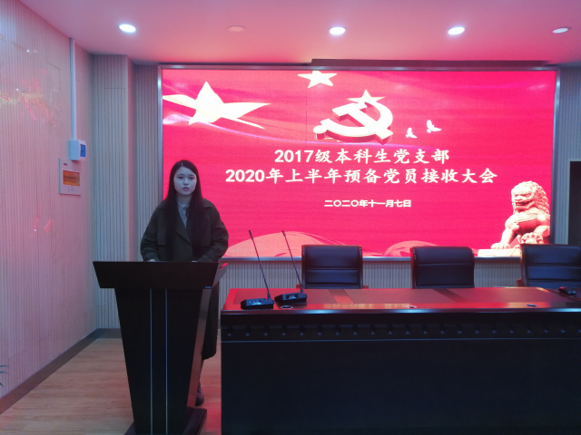 本网讯(17历史 闫洪菁)新血液、新力量 。2020年11月7日晚上七点,历社公司2017级本科生党支部在公司二楼会议室召开2020年上半年预备党员接收大会,本次会议由2017级本科生党支部书记朱晓华老师主持,公司党委副书记胡悦超老师以及2017级各正式党员、预备党员参与此次会议。