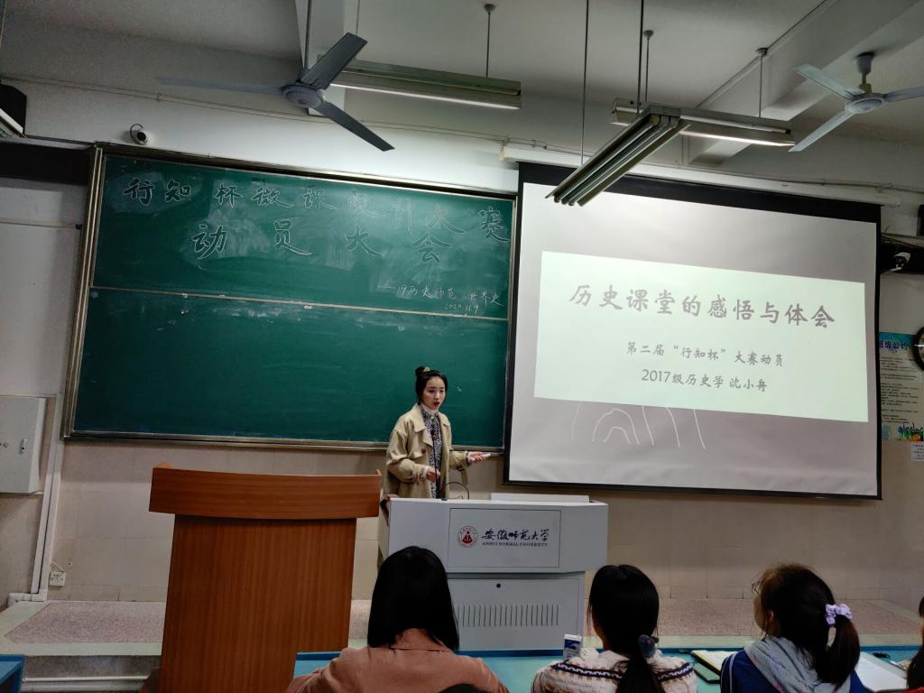(本网讯 图/文 李贵)微风习习,冬阳暖心。为充分学习微课设计相关知识以及鼓励同学们参加“行知杯”历史学微课大赛提升师范技能,19级历史师范、世界史于11月9日晚七点半联合召开了动员大会,大会邀请了17级、18级沈小舟、张超琦、张湾湾三位教学技能优秀的学长学姐为同学们细心讲解分享微课设计相关内容与教学经验,刘丁瑞同学主持了本次大会,19历史师范、世界史同学积极参与。整场大会秩序良好,气氛活跃。