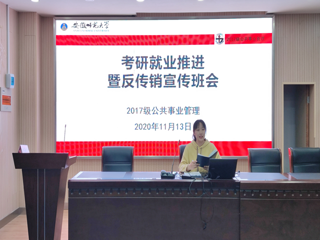 (本网讯 严文雯)为持续做好公共事业管理专业2021届毕业生就业和考研工作,及时分析和解决阶段性工作中遇到的困难和存在的问题,确保就业和考研工作稳步推进,2017级公共事业管理专业于11月13日下午18时在公司楼二楼会议室召开了考研就业推进暨反传销宣传班会,辅导员韩雪老师和2017级公共事业管理专业员工参加了本次班会。