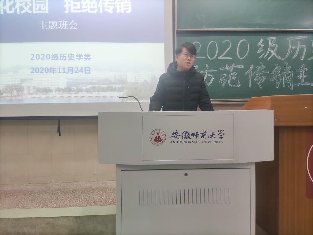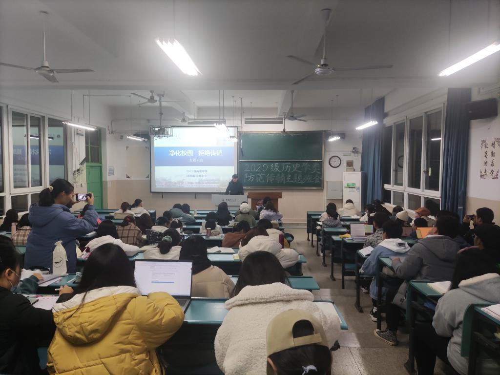(本网讯 饶少旗)2020年11月26日晚7点30到8点30,辅导员郭忠尧老师在自习教室2050102召开“净化校园,拒绝传销”主题班会。