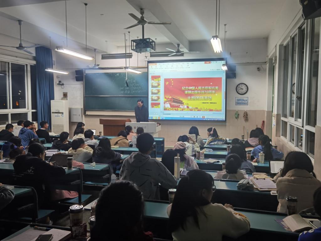(本网讯 倪子菲)为纪念中国人民志愿军抗美援朝出国作战70周年,20级历史2班响应公司号召,于2020年11月11日19:00-21:00在行知楼2050101教室举办“抗美援朝”主题团日活动。议程主要分为历史介绍、纪录片观看、习近平讲话学习、同学大讨论四部分。活动由董佚洁主持,全体同学参与。