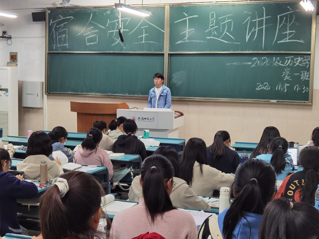 (本网讯 倪子菲)为响应公司号召,呼吁同学们关注宿舍安全问题,20级历史2班于2020年11月5日19:30-20:30在行知楼2050101教室召开由辅导员郭忠尧主持,全体同学参加,以“关注宿舍安全”为主题的特色讲座。
