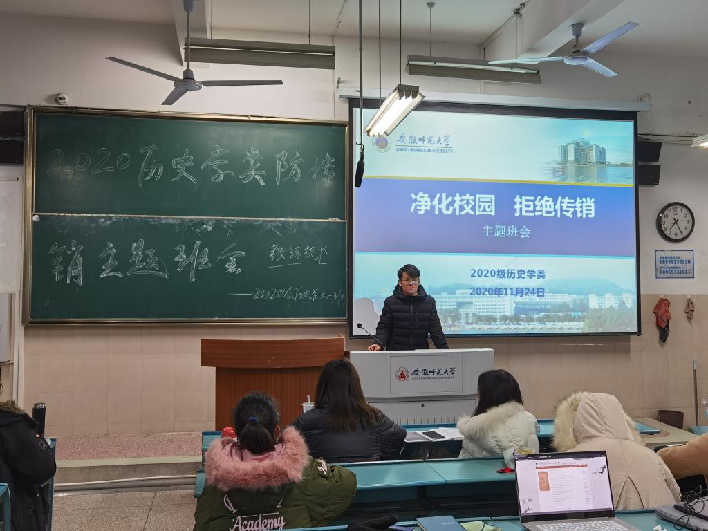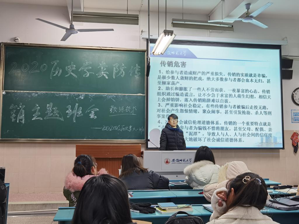 (本网讯 梁芮侨)为提升同学们防范传销的安全意识,11月26号晚19:00-19:40于行知楼2050101教室,在辅导员郭忠尧老师的精心组织下,面向2020级历史学类1班同学开展了以防范校园传销为主题的班会活动。