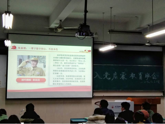 首先,刘老师从徐川的《我为什么加入中国共产党》出发,解释了什么是入党动机,分别举例,列出九条可能影响入党动机的不同方面因素,更为深刻地让同学们理解到入党的本质与初衷,给同学们作了良好的思想动员。刘老师向同学们讲述了时代楷模张富清,扶贫干部黄文秀,抗疫先锋张文宏的故事,从三个方面向同学们阐述了正确的入党动机。