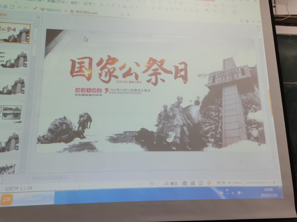 (本网讯 叶萌)为悼念南京大屠杀遇难者,让后人铭记历史、珍视和平,每年的12月13日被定为国家公祭日。2020年12月9日晚7点,2020级历史学类4班同学在团支书邹岩同学带领下,于行知楼2050102教室开展了“勿忘国耻,振兴中华”主题团日活动。