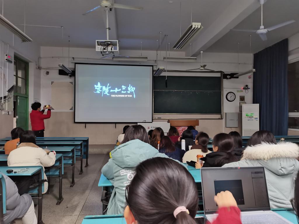 活动伊始,团支书邹岩同学给大家讲解了“南京大屠杀”相关的历史知识,介绍了这段沉痛的历史。随后,同学们共同观看了影片《金陵十三钗》,该片反映了南京大屠杀的种种景象,观看过程中同学们安静严肃,为在南京大屠杀中牺牲的战士和同胞们表达了深深的哀悼。而观看影片也旨在时刻提醒同学们不要忘记过去,要在历史中汲取教训,珍惜来之不易的和平。