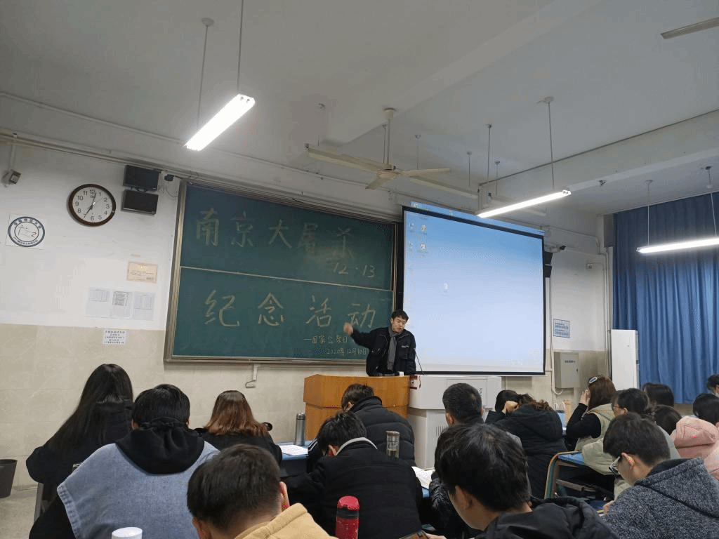 活动伊始,宣传委员带大家回顾了83年前发生在南京的这场惨痛的历史,揭露了日本帝国主义列强犯下的种种罪行,我们的30多万同胞惨遭杀戮!我们们的家园被摧毁等等。