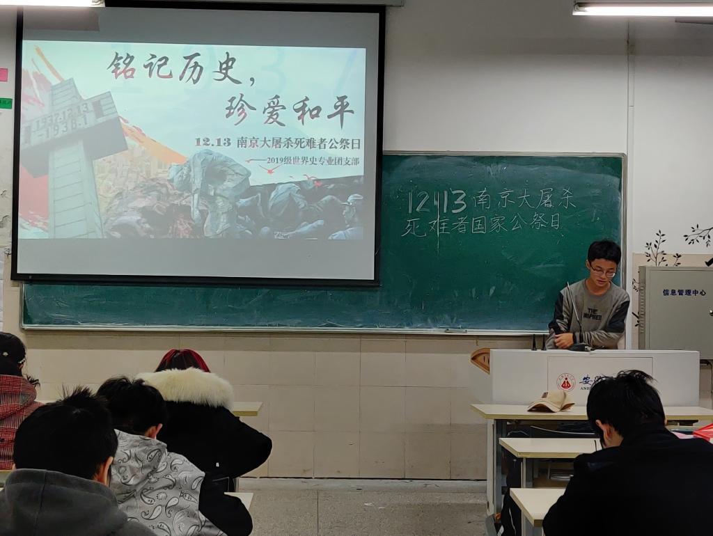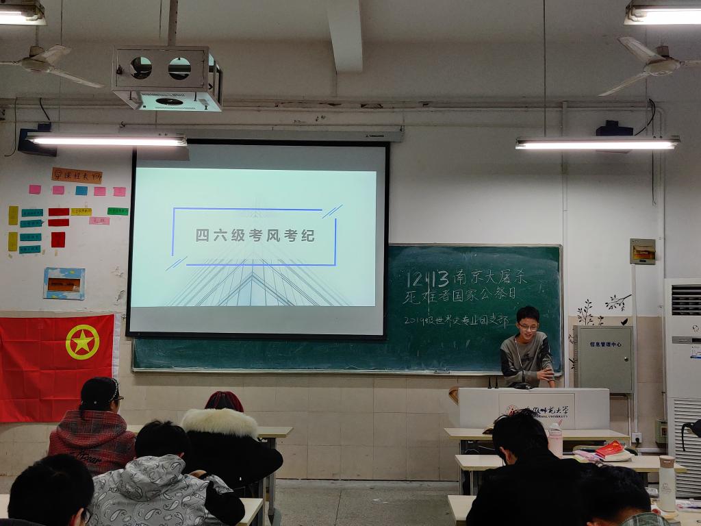 (本网讯:19世界史何宇立 马志伟)1937年12月13日,侵华日军攻占南京,制造了震惊中外的南京大屠杀惨案。前事不忘,后事之师。为了更好地铭记历史,展望未来,增强同学们的爱国主义精神,19世界史于12月11日晚7点,在固定教室2040101A举行了“12.13”南京大屠杀纪念活动,暨四六级考风考纪主题班会,全班同学参会。