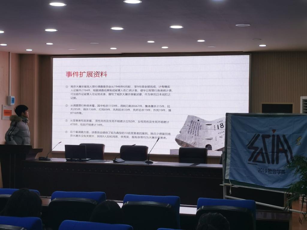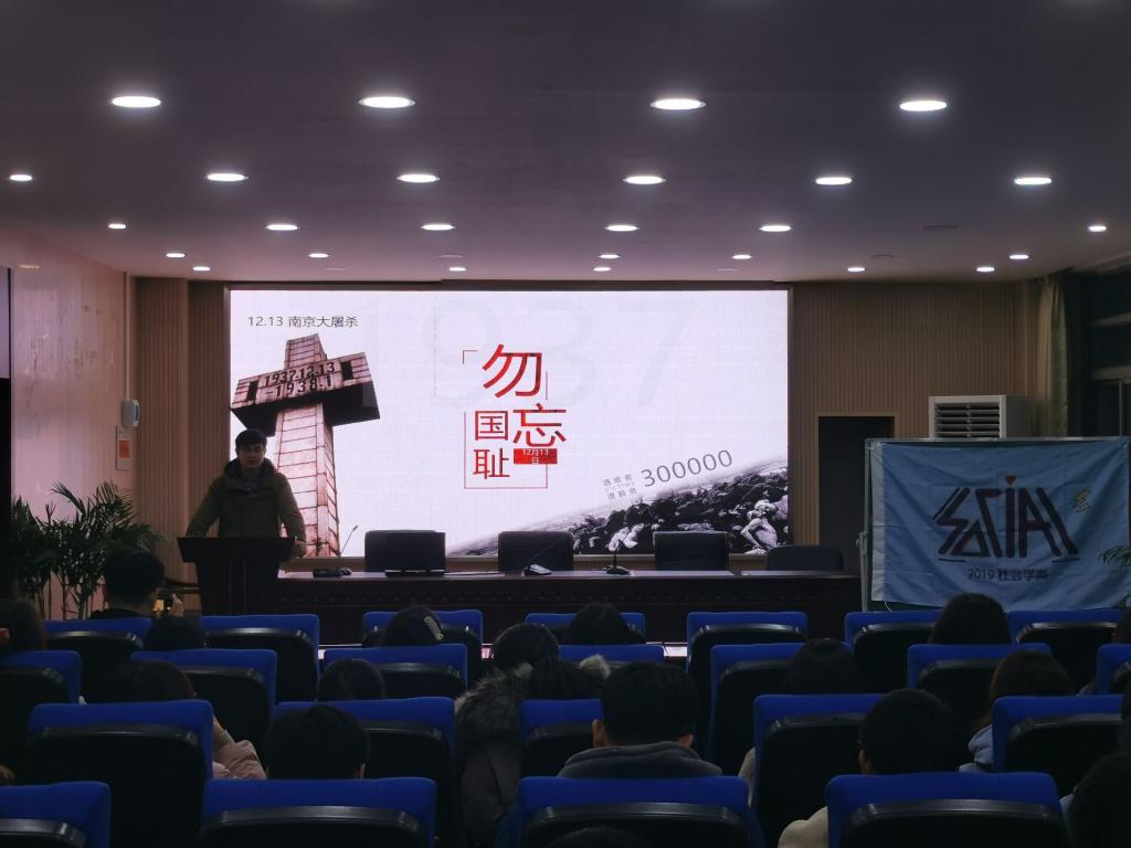 本网讯(19级社会学类 图文/李卓麟)2020年12月13日是第七个南京大屠杀死难者国家公祭日。为牢记历史,激发同学们的爱国热情,我班于12月12日下午在公司二楼报告厅举办了“勿忘国耻—悼念南京大屠杀遇难同胞”主题班会。我班辅导员朱老师及全体19级社会学类新生参与了此次班会,会议由团支部副书记倪正然主持。