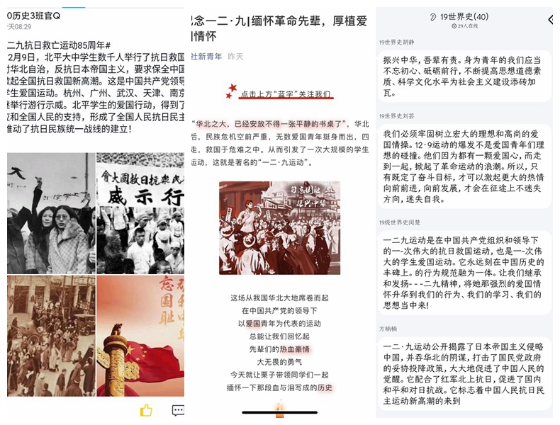 在线下开展观影活动的同时,院团委号召各支部积极开展线上宣传。通过班级官Q互评转发、开展线上研讨会、公司微信公众号等深入员工生活的新媒体工具进行一二·九运动的宣传,扩大了活动影响,加强对青年团员耳濡目染的爱国主义教育。
