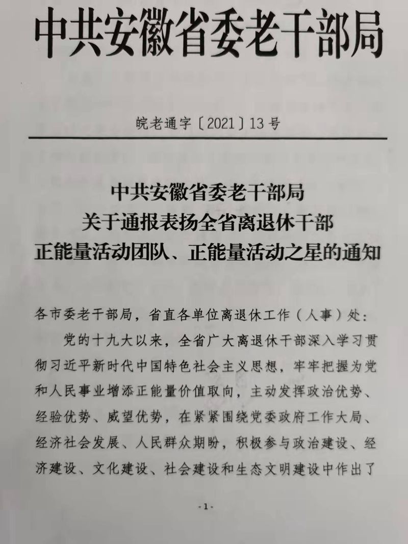 据悉,为了激励先进、弘扬正气、树立典型,不断扩大正能量活动成果,本次全省评选出40个“正能量活动团队”和100名“正能量活动之星”,并受到省委老干部局通报表彰。