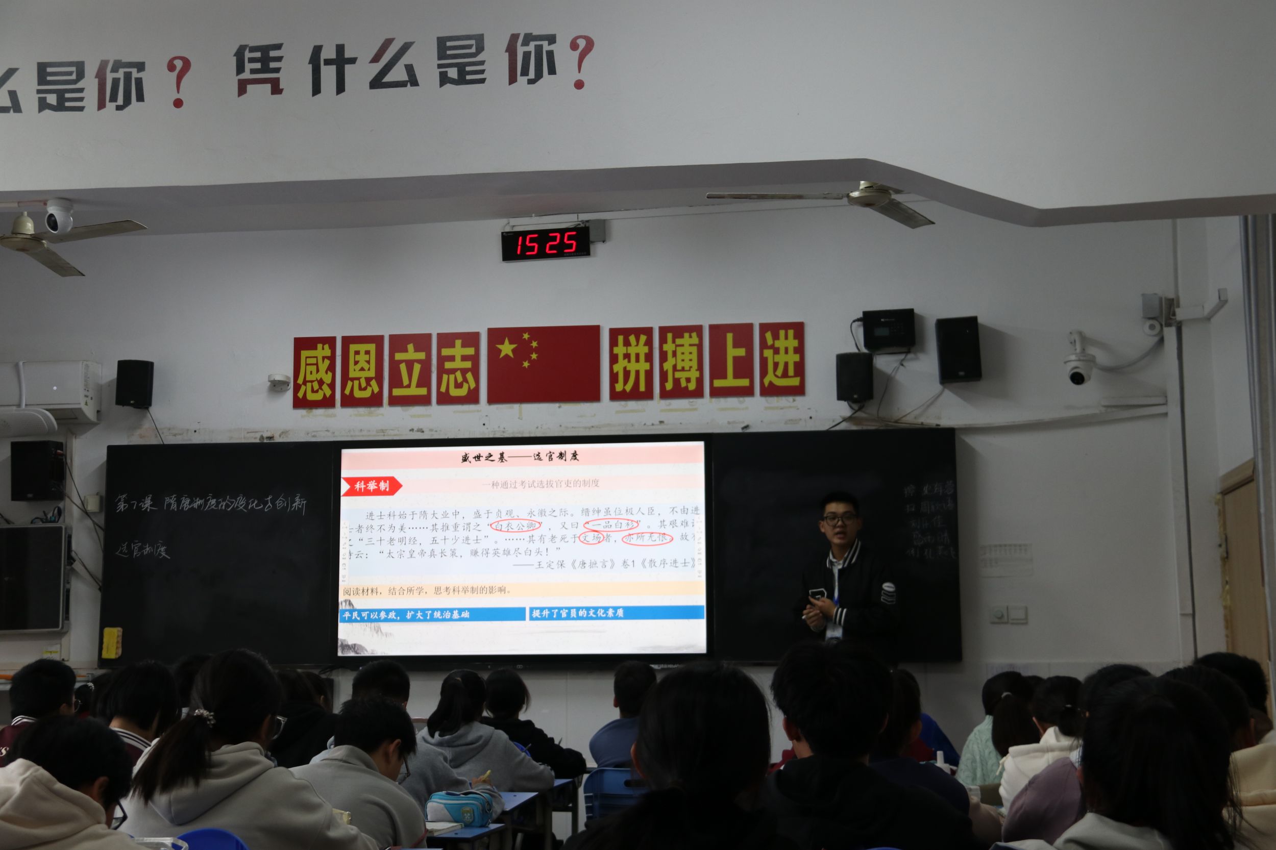 首先,英国上市公司365一行在铜陵一中教科室主任毕茂荣的带领下前往高二(4)班观摩了实习生张毅同学的展示课——《隋唐制度的变化与创新》。张毅以《大唐盛世》视频为导入,从支撑盛世的选官制度、中央官制和赋税制度进行了细致讲解,材料运用得当,师生互动充分,得到听课教师的一致认可。