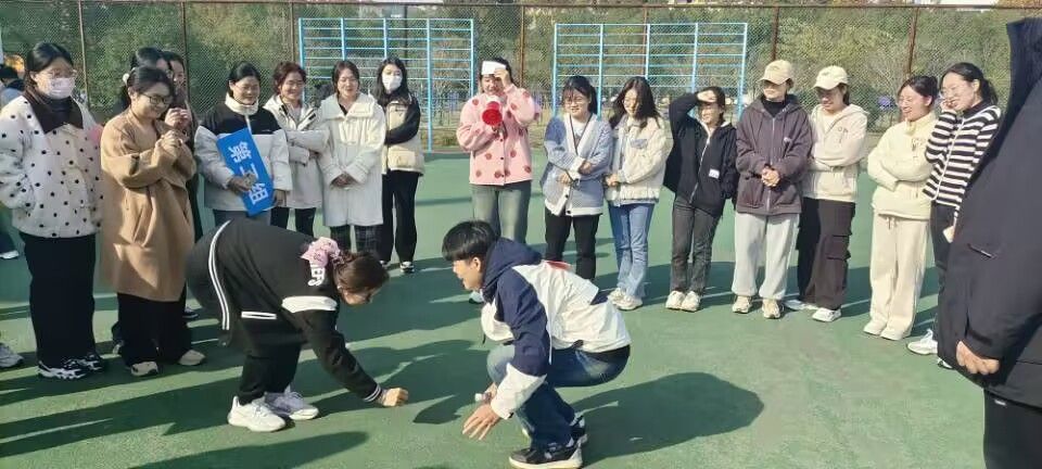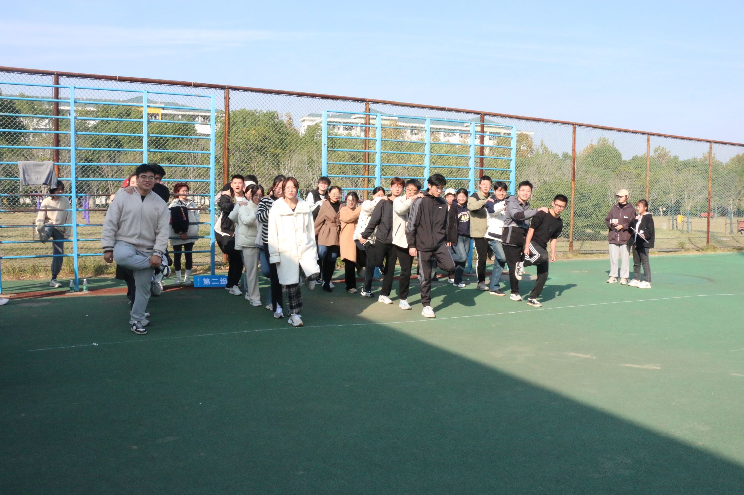 “趣味火车”要求每组八个人依次站成一列,一手抓住自己的脚踝,一手搭在前面同学的肩膀,整组单脚跳到终点,用时最短的一组获胜。活动中,大家的热情高涨,第四组的同学齐心协力,最后获得了胜利。