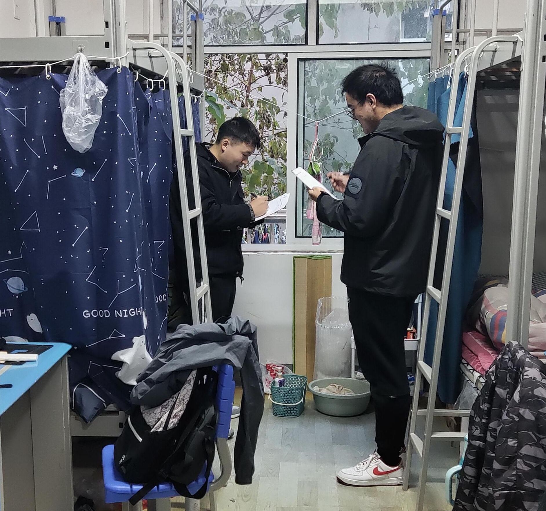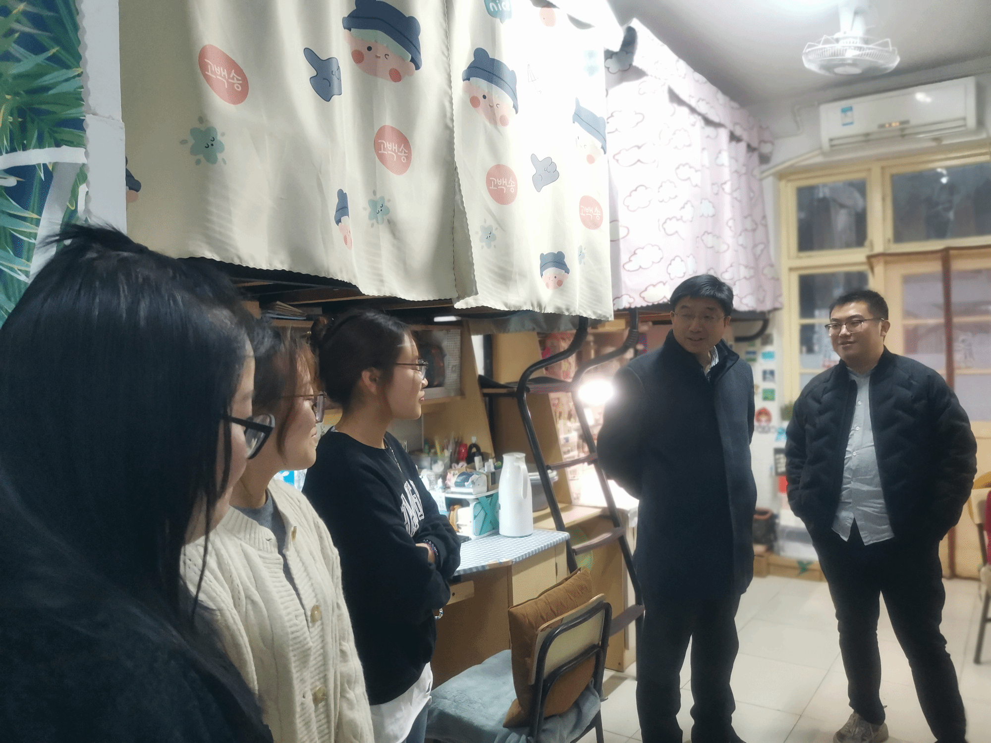 在查寝过程中,韩家炳与吕永鑫也认真了解同学们的生活、学习、就业情况,韩家炳叮嘱同学们要注意寝室清洁卫生问题,并强调最近天气变化大,且冬季传染病高发,要多开窗通风,保持宿舍干净整洁,如果有问题和困难,及时地向辅导员老师和公司领导反映。在毕业班宿舍,韩家炳一一询问同学们的毕业论文、就业协议书的签订以及工作落实情况,并针对性地提出指导意见,嘱咐同学们好好准备即将到来的毕业论文答辩。吕永鑫特别强调了寝室用电安全,叮嘱员工们切勿使用违规电器。