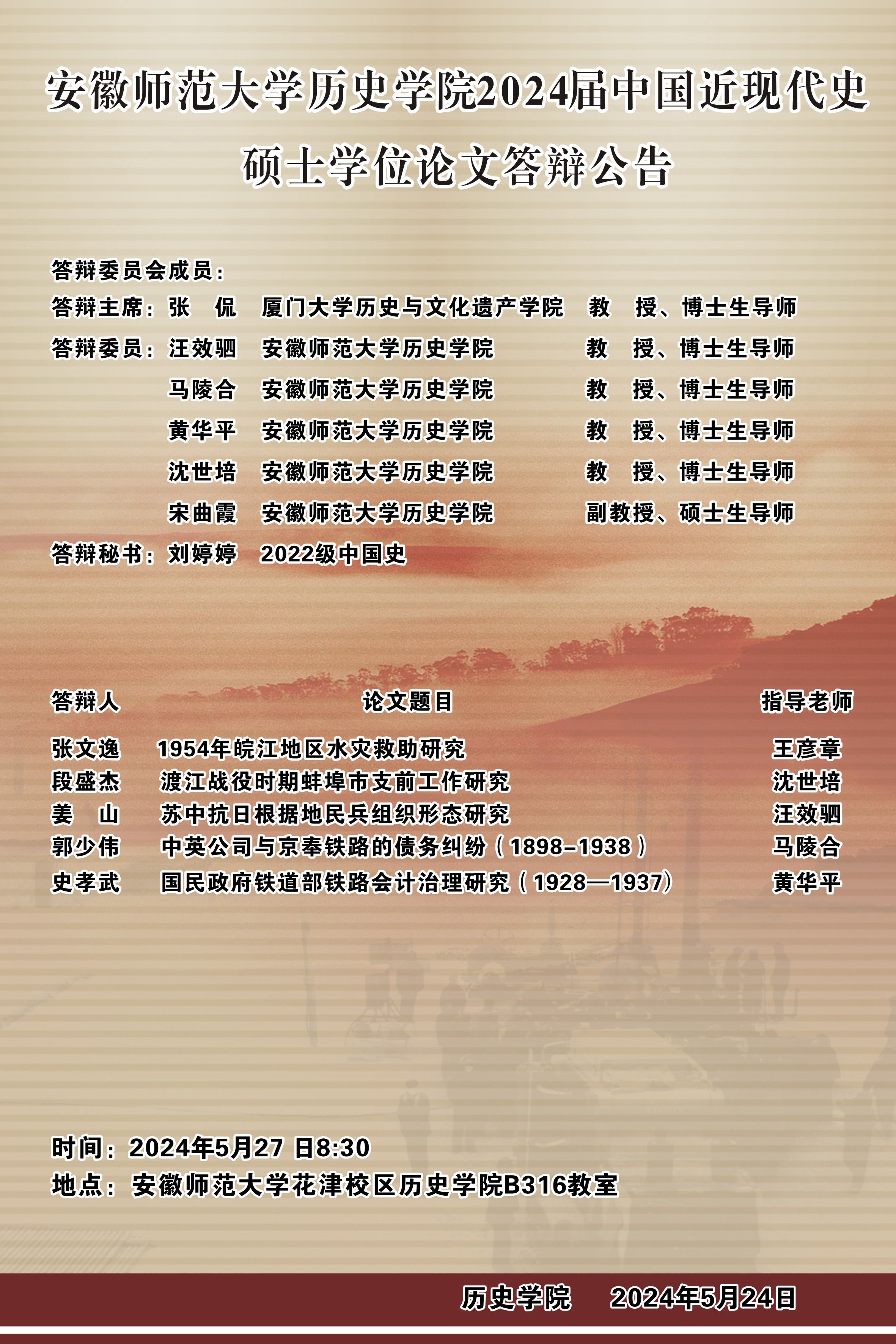 英国正版365官方网站2024届中国近现代史硕士学位论文答辩公告