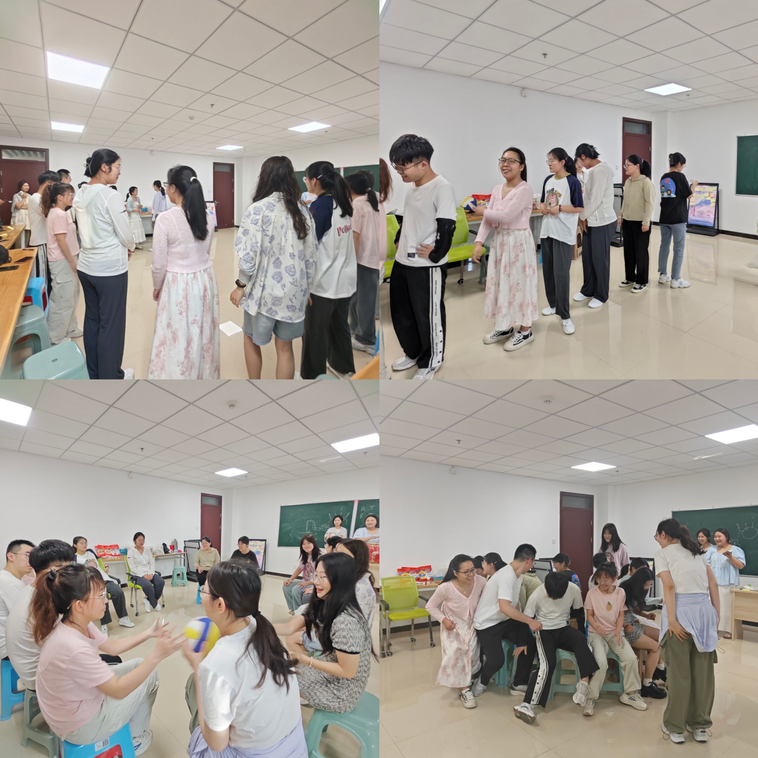 在“爱的抱抱”游戏中,大家纷纷抢先抱在一起,场面十分热闹;在“默契之旅”游戏中,考验的是大家的画工、脑力、当然还有最重要的默契力,两个小组的成员为了画出最贴切的图案,动笔前都要苦思冥想许久。好在努力没有白费,队员们大都能猜出准确答案。“击鼓传球”游戏最是激动人心,在紧张激烈的击鼓声中,球仿佛是一个烫手山圩;“抢椅子”环节则高度凸显了大家的礼让,甚至可以说是“让游戏”。