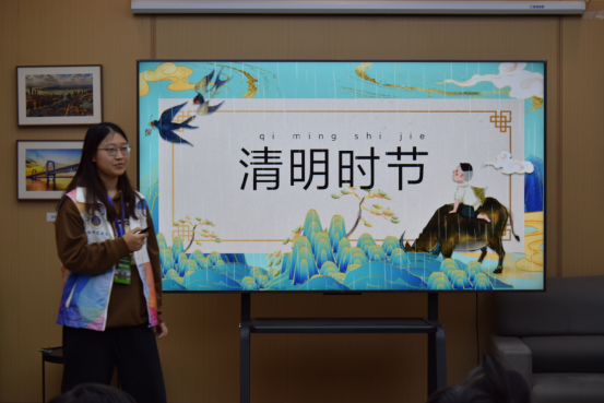 课程伊始,余子童以清明节的诗句激起了孩子们上课的兴趣。随后她带领孩子们穿越时空,探寻清明节的起源。余子童首先讲述了春秋时期介子推“割股奉君”的忠义故事,向小朋友们生动还原了寒食节禁火冷食的习俗;随后再结合古代农耕文明对自然节气的敬畏,阐释清明从“踏青迎春”的农事节气演变为融合了祭祖、感恩与生命教育的传统节日的演变过程。最后余子童通过“绵山焚火”“插柳避灾”等历史典故,让孩子们深刻体会到清明节承载的忠孝文化与人文精神。