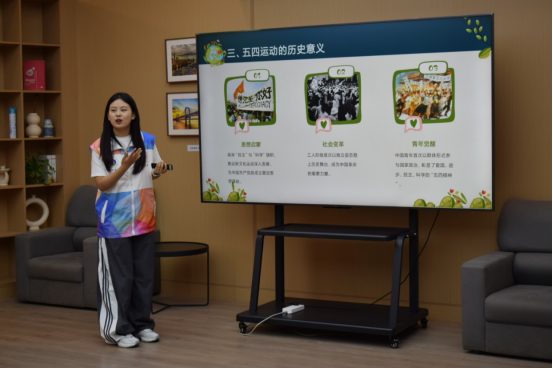 活动伊始,杨悦介绍了五四青年节的源起——1919年5月4日爆发的“五四运动”。接着,她条理清晰地讲述了“五四运动”的起始、发展、最终结果以及其所蕴含的时代意义。这一讲解引发了小朋友们的热烈讨论,充分调动了他们的积极性和好奇心。随后,杨悦进一步讲述了五四青年节设立的具体过程,使小朋友们对五四青年节有了更为全面的了解。