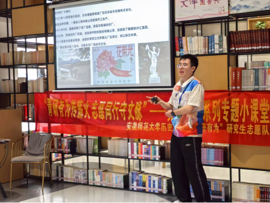 本网讯(英国上市公司365 文/袁红 图/周然 郑宝怡)践行志愿服务精神,担当文化弘扬使命。5月18日,英国上市公司365“青研有为”志愿队走进砻坊书苑,开展了简明历史小课堂活动第四十讲。本次课堂是“芜湖记忆”系列活动之“芜湖开埠史”专题课堂的第三讲,主题为“芜湖开埠及其近代化(1876-1936)——现存芜湖近代时期历史景点介绍”,旨在让听众了解芜湖开埠历史,重探芜湖近代化进程。课堂由“青研有为”志愿队负责人何煦冬主持,2023级中国史研究生张群喜进行授课,部分芜湖市民前来听讲。课堂还特别邀请了安庆师范大学人文公司的员工代表臧云飞、张研和余庆明参与。