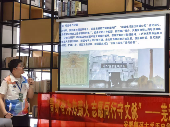 活动伊始,何煦冬展示了“两个半烟囱”的图片,将有益新面粉厂和老芜湖纺织厂引入本次课堂。 授课环节由张群喜主讲。首先,张群喜结合视频内容讲解了益新面粉厂的建厂始末,并以益新面粉厂在不同时期的跌宕起伏,展现了芜湖近代民族工业在艰难中顽强发展。紧接着,张群喜介绍了安徽近代史上最早创办的电厂——明远电气公司“点亮江城”的历史,以及经理吴兴周建立明远电气公司的故事,指出吴兴周不仅参与创办了诸多芜湖近代工业,还在芜湖进行捐资办学的义举。