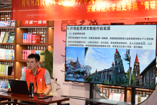 在授课过程中,何煦冬首先介绍了近代基督教在中国的传播历程,以及基督教不同教派教堂的建筑结构特点,进而逐步深入到近代芜湖基督教的传播情况。他图片、纪录片等方式,介绍了圣雅各教堂、芜湖天主堂等近代芜湖教堂建筑的典型特点。此外,何煦冬还以大事记的形式,梳理了芜湖天主堂圣母院旧址的历史演变脉络,新中国成立后,该建筑被改造为芜湖市第一人民医院的儿科诊室办公地,实现了建筑功能的华丽转身。随后,何煦冬通过播放视频和展示大事记的方式,介绍了弋矶山医院的历史发展。