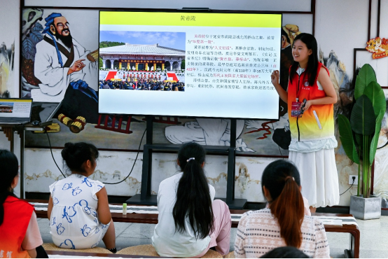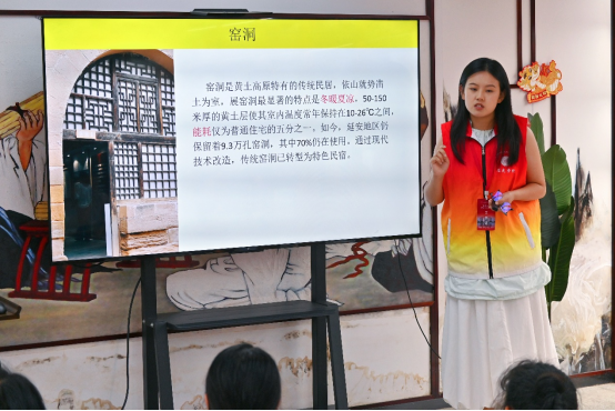 活动伊始,杨悦以延安独特的自然地理开篇。她结合PPT生动阐释了延安沟壑梁峁的地貌特点,母亲河——黄河作为“天然省界”奔腾而过,塑造了世界奇观乾坤湾与壶口瀑布;从传统历史入手,杨悦介绍了“华夏第一陵”黄帝陵跨越数千年的祭祀传统,揭示了延安作为中华文明重要源头的深厚底蕴。杨悦还邀请小朋友们进行课堂互动,请小朋友说说自己了解的黄帝。随后,杨悦又剖析了窑洞的居住功能,指出窑洞作为黄土高原的智慧结晶,其“冬暖夏凉”的生态特性与如今的建造转型,反映了传统与现代的融合。