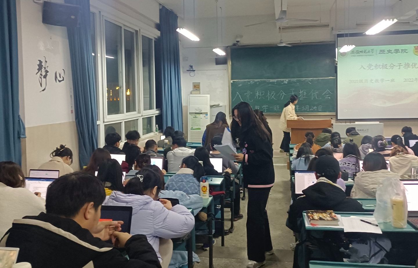 本网讯(邢伍如意)为进一步做好入党积极分子推优工作,2021级历史学师范教学一、三班团支部于3月24日晚7点召开入党积极分子推优会。此次会议由辅导员韩雪主持,2021级历史学师范教学一、三班全体同学参加。