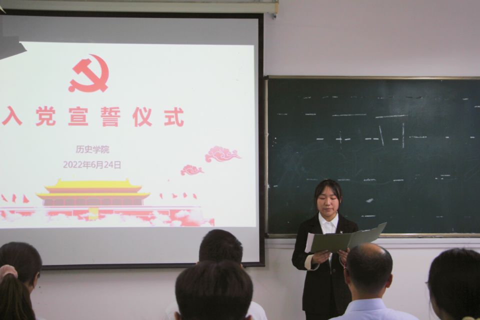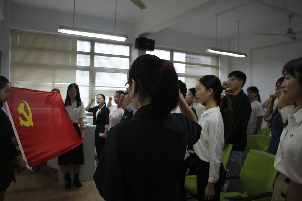 入党宣誓仪式在庄严肃穆的国歌声中正式开始。胡婷宣读了公司党委关于批准发展预备党员的通知。老师们为预备党员们发放党徽与党费证,叮嘱预备党员们要不忘初心、砥砺前行。在2019级历史学(师范)叶冉的带领下,全体同志面向鲜红的党旗进行宣誓。各位同志们热情高昂、声震教室,向着党旗许下庄重承诺。