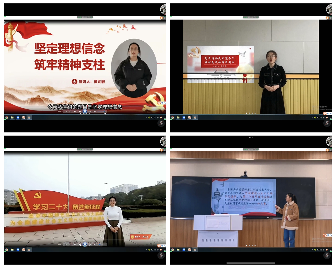 党支部副书记张文逸在会上强调了学习宣传贯彻党的二十大精神的重要意义,要求大家认真学习二十大报告原文,深入领悟报告中提出的新思想新论断、作出的新部署新要求,扎实推动党的二十大精神入脑入心、落地落实。随后,几位党员同学开始结合自己的学习体会宣讲党的二十大精神:黄兆敏分享了“坚定理想信念、筑牢精神支柱”的重要性;张晨从二十大报告中感悟到员工党员应“心中有信仰”,才能“脚下有力量”;史雨欣宣讲的主题是“弘扬伟大建党精神”;郭宇琴讲述了“为民造福”的重要性;梅立浩为我们展示了“踔厉奋发、勇毅前行”的党员形象。党员同学们或结合制作精美的PPT、或依托校园党建文化场地开展宣讲,宣讲内容理论与实际结合,深入浅出,起到了较好的效果。