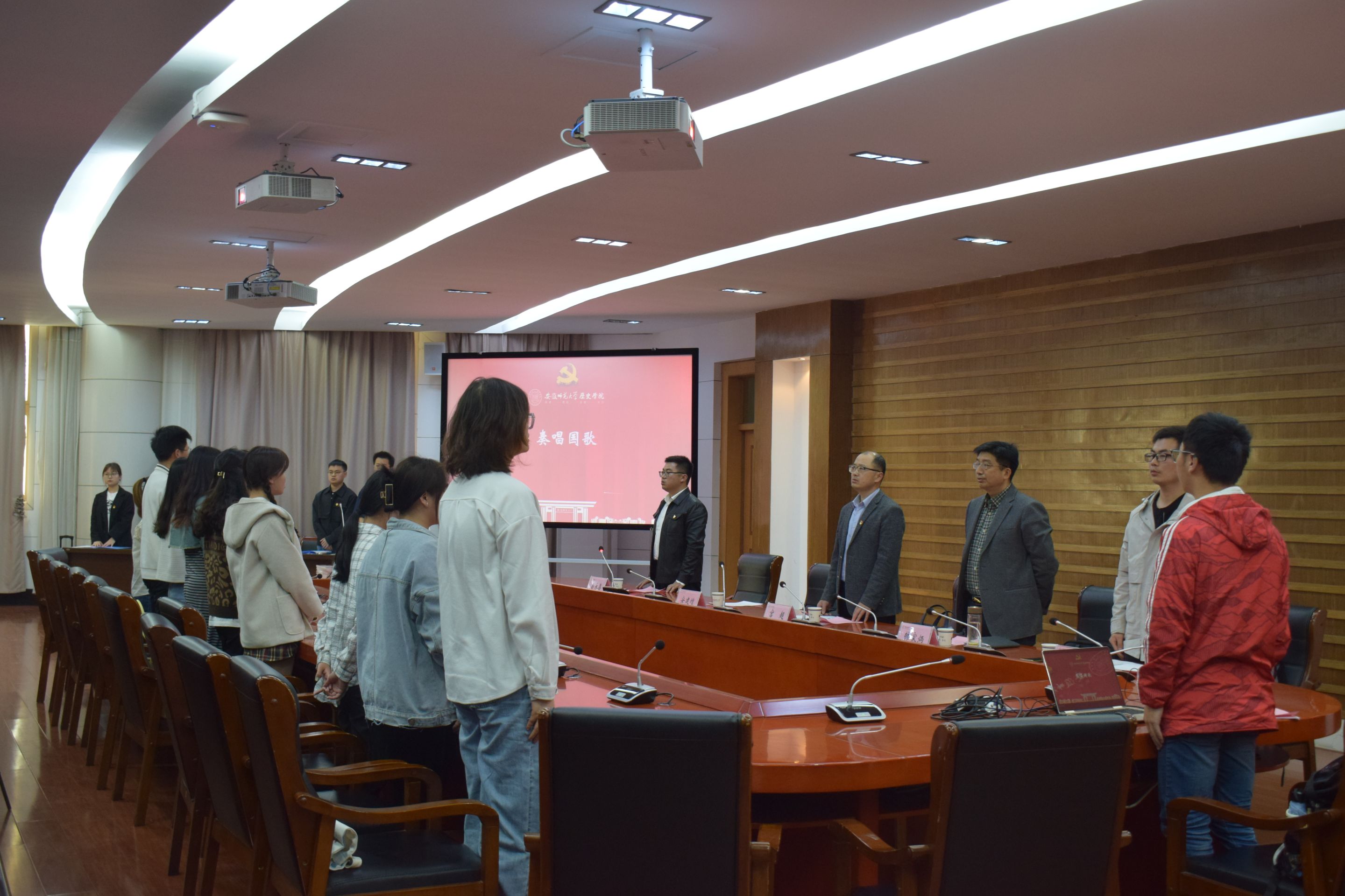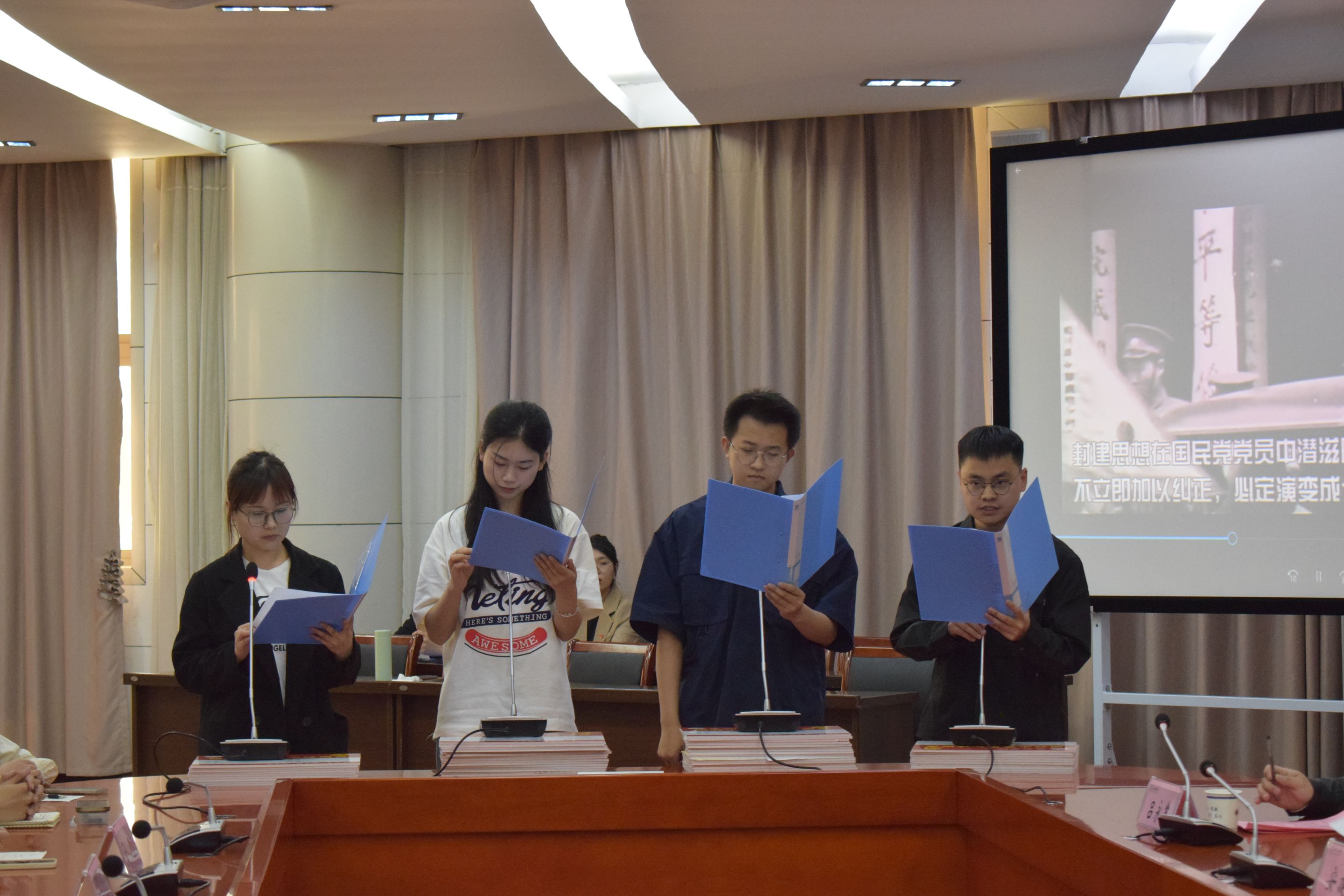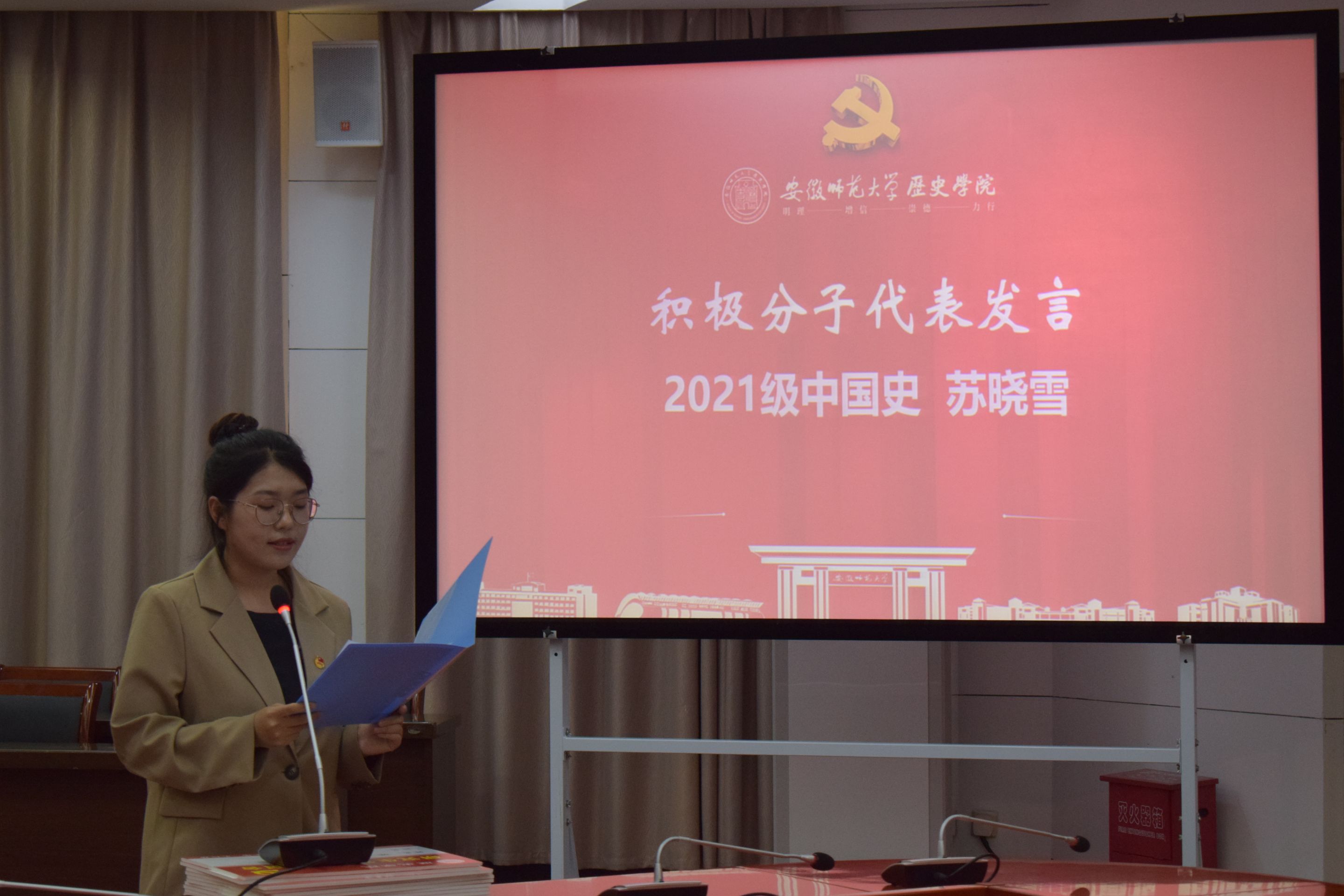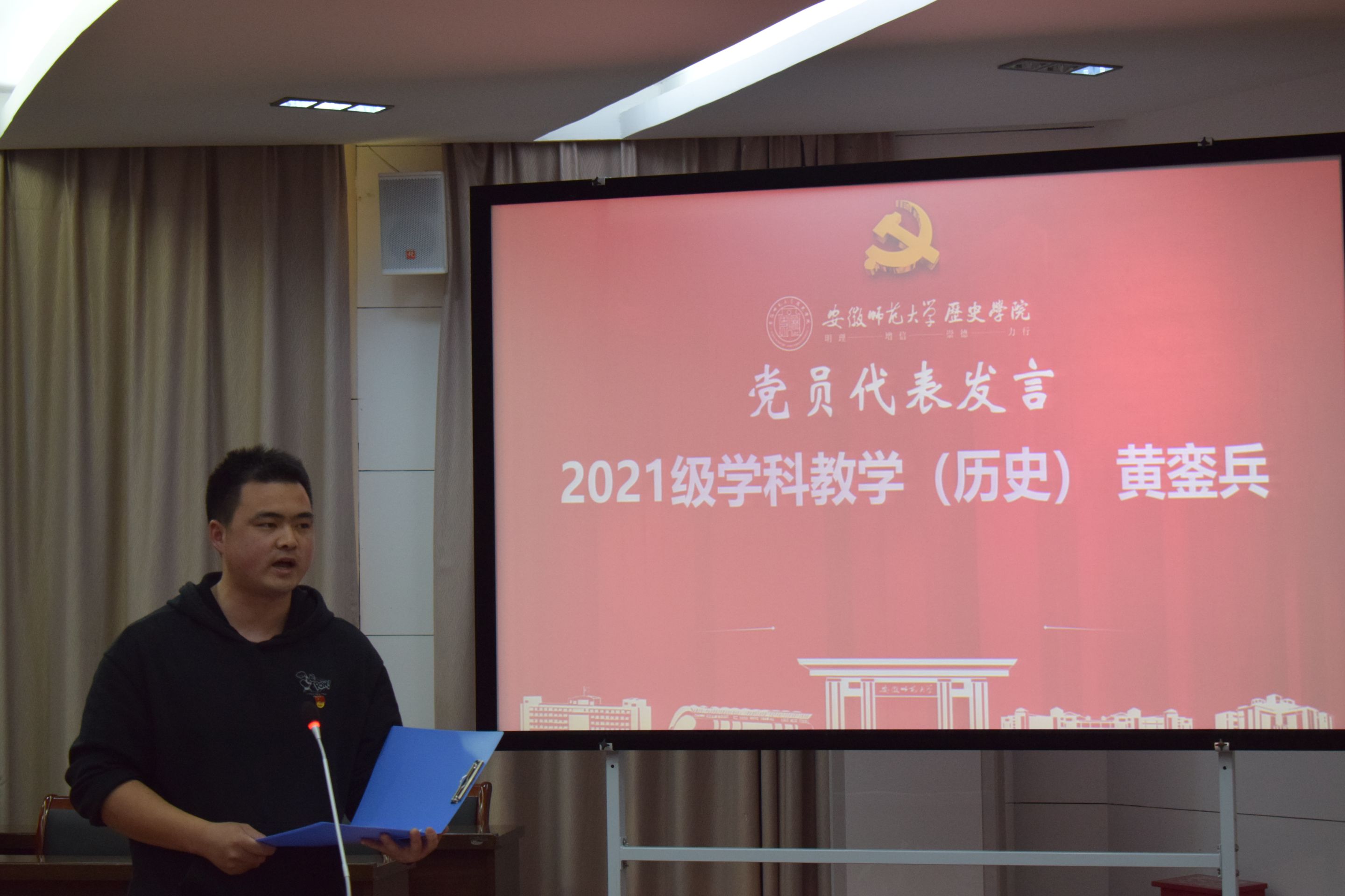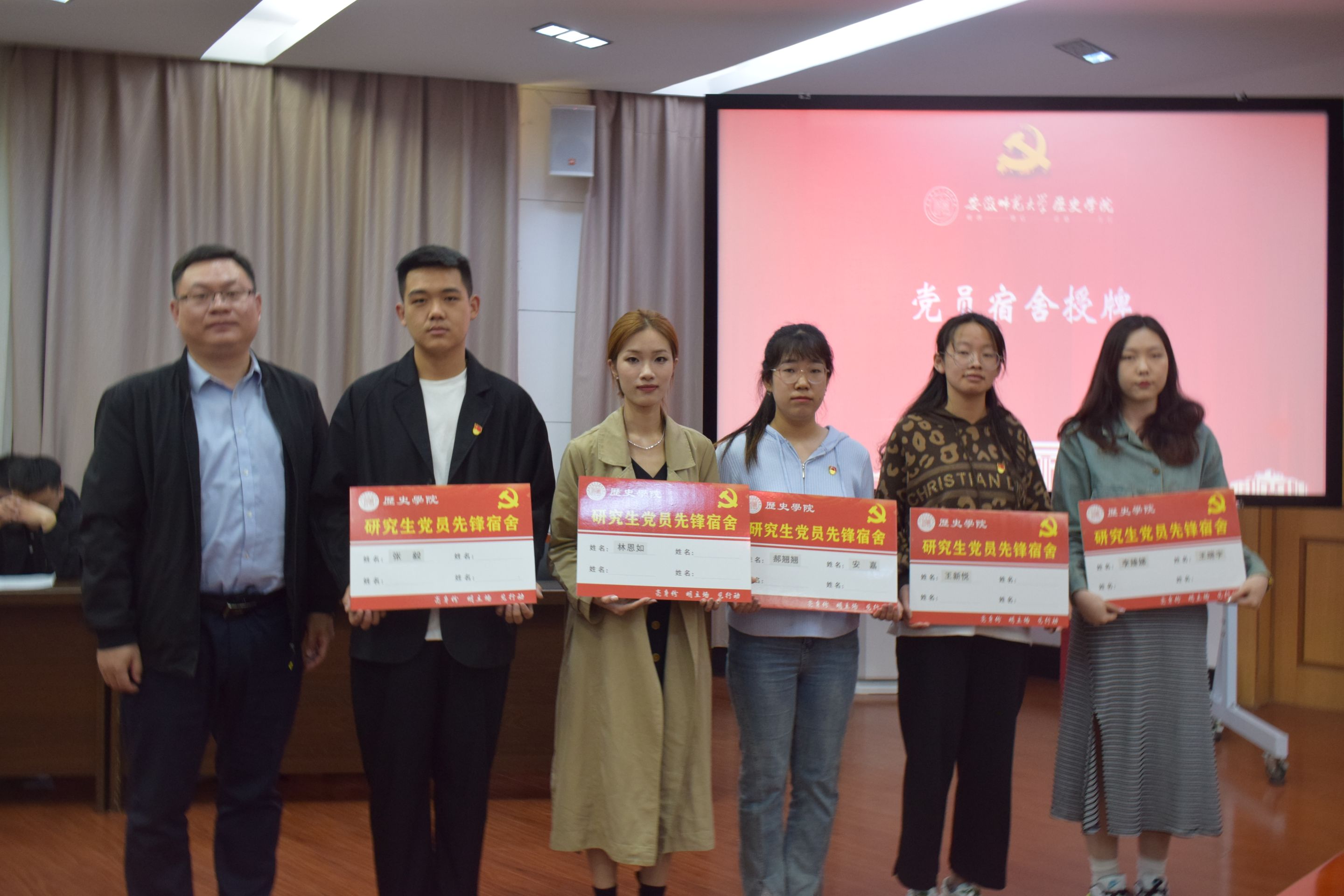 活动在嘹亮的国歌声中拉开序幕。为缅怀党的百年历程中曾经流血牺牲的革命先烈,牢记伟大胜利来之不易,在观看视频《党的苦难》后,姜山等四位同志朗诵《四·一二反革命政变96周年祭文》,结束后全场起立共唱国际歌,以此悼念牺牲的革命先烈。韩家炳、安建增宣读党员宿舍名单,并为党员宿舍授牌。黄銮兵作为党员代表发言,号召在座党员学思想、强党性、亮身份、重实践、建新功,将个人成长融入时代洪流,积极投身实践,让师生看到研究生党员的模范带头作用。专硕党支部书记尹蒙蒙宣读最新一批积极分子确立名单。苏晓雪分享了自己确立为入党积极分子这一年的心路历程,表示将积极向党组织靠拢,更加严格要求自己,踔厉奋发,勇毅前行,将自己的青春力量融入振兴师大的火热实践。