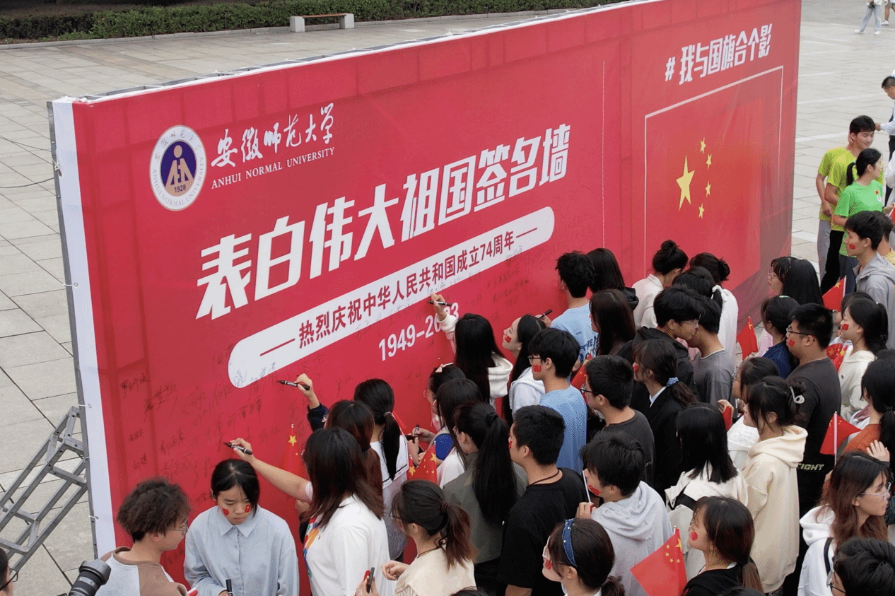 升旗仪式结束后,现场师生纷纷参与到“表白伟大祖国”签字活动和“我和祖国合个影”活动中来,用真挚的语句书写了自己对祖国的热爱与赞美,用实际行动庆祝中华人民共和国成立74周年。