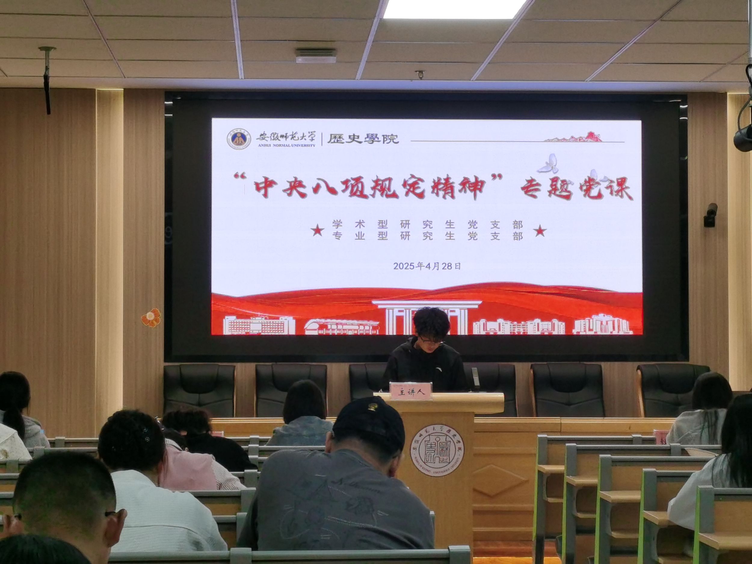 本网讯(英国上市公司365 姚霞 戴鹏)为深入贯彻中央八项规定精神学习教育工作要求,强化支部党员作风建设,英国上市公司365学术型研究生党支部、专业型研究生党支部于2025年4月28日下午,在文典楼B108会议室联合举办了“中央八项规定精神”专题学习党课。党课由学术型研究生党支部书记吕永鑫主讲,全体党员参与学习。