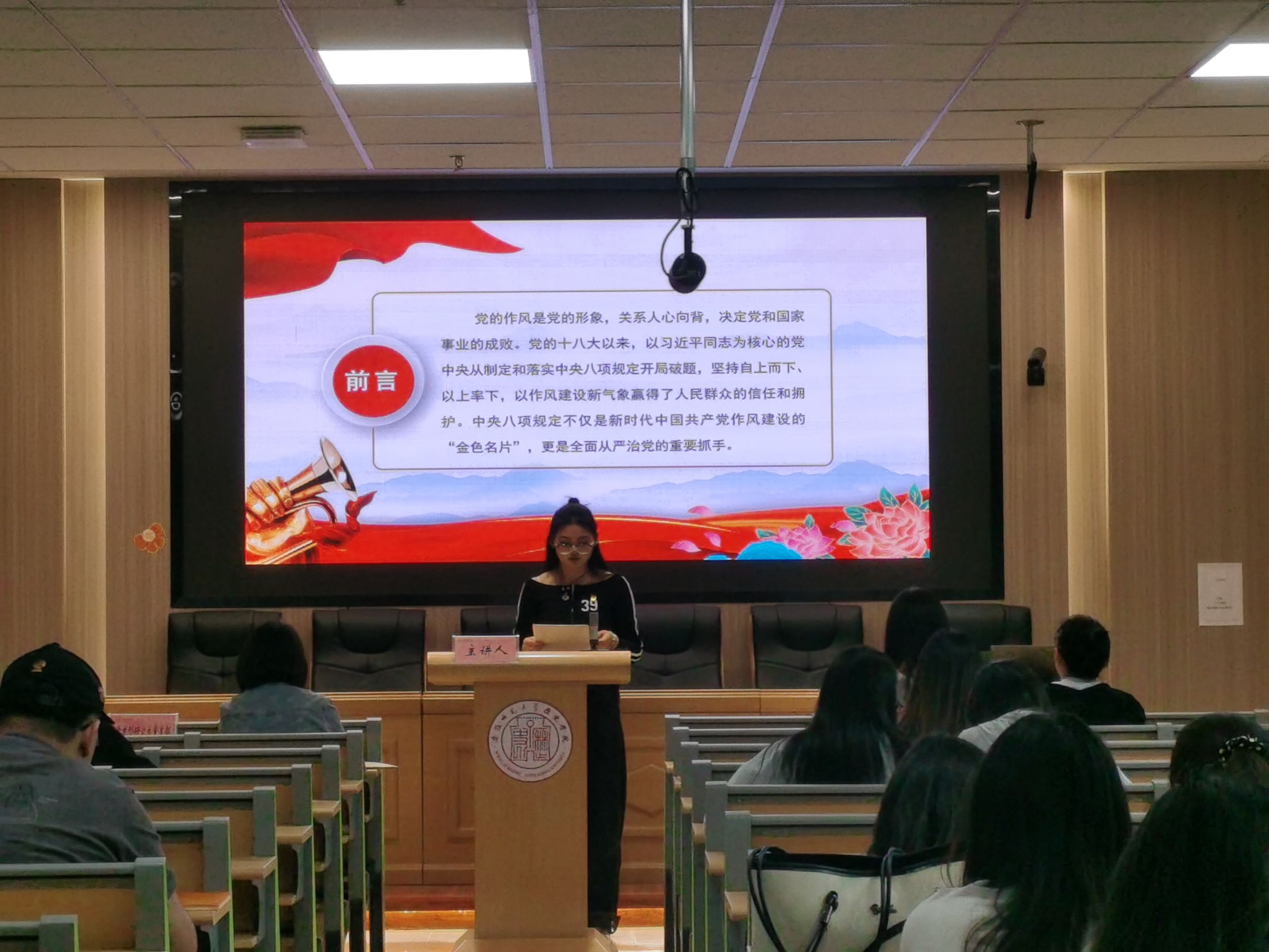 会议伊始,学术型党支部宣传委员戴鹏传达了上级部署安排。随后,周婉茹详细介绍了中央八项规定的具体内容,并对中央八项规定精神进行了个人分享。再后,支部通过短视频《污点》,开展了警示教育,提醒所有研究生务必深入领会中央八项规定精神,加强底线意识。