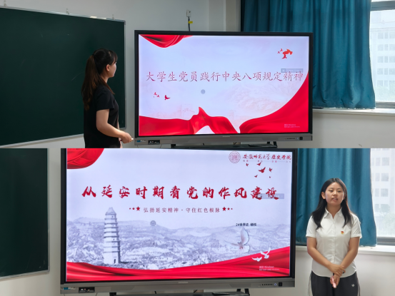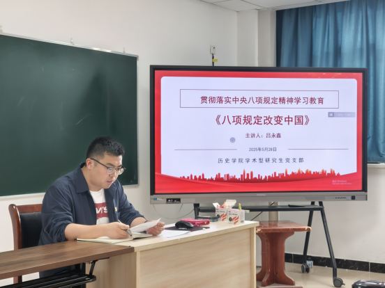 在专题学习环节,支部书记吕永鑫领学《八项规定改变中国》,并结合工作实际,进行专题分享。24级中国史党员李垚毅、世界史杨悦分别作专题研讨分享《老员工党员践行中央八项规定精神》《从延安时期看党的作风建设》。在学习中,同志们重点探讨了如何在校园生活中践行中央八项规定精神,如深化思想认知、树立正确价值观、在学术研究中践行务实作风、向榜样学习、在实践中内化精神等。