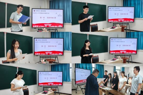 在党员发展环节,五位同志依次就理论学习、思想转变历程及入党动机展开汇报,入党介绍人从思想动态、学习科研、日常表现等方面进行综合评价,既肯定成绩也指出不足之处。随后,纪检委员田晶晶依次宣读政治审查结果,与会党员也积极讨论了何煦冬等五位同志的整体表现,并指出进一步改进方向。最后,大会进行无记名投票进行表决;经现场表决,支部大会同意接收何煦冬等五位同志为中共预备党员。