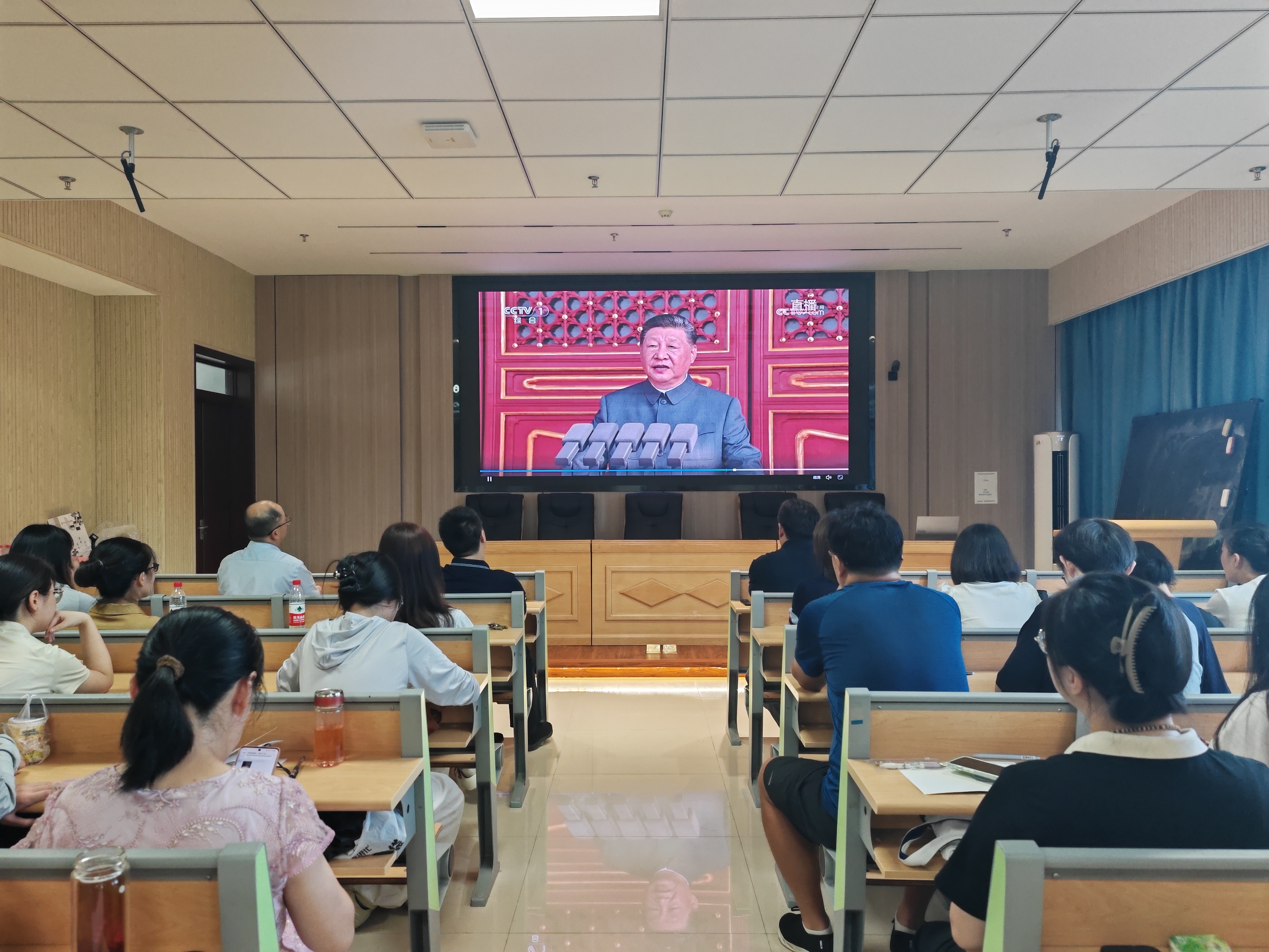 收看过程中,与会师生认真聆听了习近平总书记重要讲话,详细记录讲话要点,深入思考精神内涵。师生们共同见证了受阅部队在长安街列阵,光荣接受中共中央总书记、国家主席、中央军委主席习近平检阅的历史时刻,当空中护旗梯队、徒步方队、战旗方队、装备方队、空中梯队依次通过天安门广场时,与会师生沉浸其中,被壮观震撼的场面深深感染,民族自豪感和爱国热情油然而生。